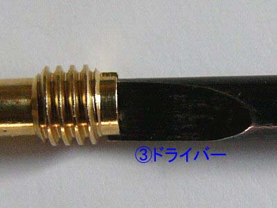 | ・③ ドライバーの刃先巾は3.8㎜で、 ジェット頭のマイナスミゾの巾 3.75㎜とピッタリです。 ・④ ドライバーの刃先巾は5.0㎜で、 ジェットの頭のマイナス部分からはみ出してしまいます。 ・適切なのは、④の方です。 |