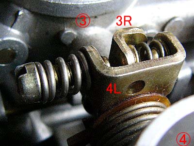 | ・各キャブレターにはバタフライに直結されたシャフトが通っています。 各々のシャフトは両端で 「 コの字形ジョイント 」 によってつながっています。 ・スロットルワイヤーは 3番につながっています。 スロットルワイヤーが引っ張られると 3番のシャフトが回り、 それが 「 コの字形ジョイント 」 を介して 他のキャブレターのシャフトを回します。 ・写真は 3番と4番です。 ・スロットルワイヤーが引っ張られると 3番シャフトが回転し3番バタフライが開きます。 それと同時に、3Rと4L を介して 4番シャフトが回転し、4番バタフライが開きます。 ・3Rが動けば 3番バタフライが開き、4L が動けば4番バタフライが開きます。 だから、3Rと4Lの当たり具合を変えれば、3番バタフライ開度と4番のバタフライ開度が変わることになります。 |