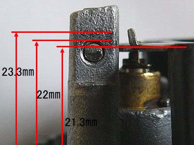 | 高さの目安は、 ・ピン穴の上端までが 22㎜、 ・ピンにかぶさっているアームの回転部の上端までが 23.3㎜、 ・ピンの上部 1/4 弱までが 21.3㎜ 。 ・なお、ピン外径は 2.45㎜Φ、ピン穴内径は 2.5㎜Φ。 アームを水平にすると、その上端面の延長線が ピン上部 1/4弱を通る。 この時、フロート上端はアーム上端面と一致。 つまり、フロートアームを水平にしたときに、 ・リップがバルブ突起の先端に触れた瞬間なら H寸法は 21.3㎜ で調整不要。 ・まだ触れていなければ H寸法は 21.3㎜より小さいので、リップを出して調整。 ・すでに触れていれば、 触れ始めるところまでアームを上げてフロートの最高位置が23.3㎜までならOK。 それ以上なら、H寸法は23.3㎜より大きいので、リップを引っ込めて調整。 |