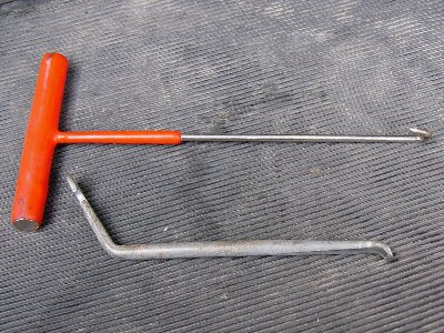 ・ゴムジョイントをめくるのに、スプリングフックを使いました。 先がとがっているので先を丸くするか、無理をしないことが必要です。 ・自転車用のタイヤレバーを削れば、めくるのに適した道具が作れるかもしれません。 ・なお、三度目はシリコングリスのおかげで、このフックを使わずに指ではめることができました。 |