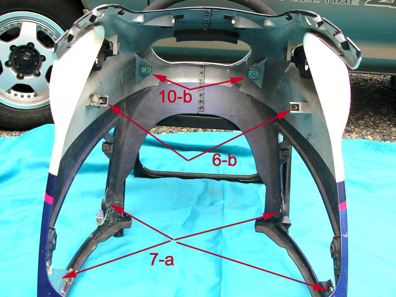 ・メーターカバーを取り外して、ヘッドライト取り付けボルト( 10-b )を内側から外す。