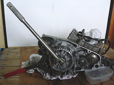 | ・ギヤはできるだけバラさないようにセットで外す。 ・そのためにクランクケースを寝かす。 |
