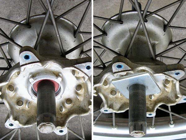 ⑥微調整 ・スペーサがベアリング内輪からずれないように、アクスルシャフトを差し込む。 ・そのまま古いベアリングを叩く。 ハンマーで直接叩いてもよいし、角ブレートを当てて叩いてもよい。 フロントフォークのオイルシール打ち込みのように鉄パイプを使う必要はない。 ・アクスルシャフトを抜いて動きを確認。 古いベアリングを外さなくてもよい。 古いベアリングの内輪もスペーサと一体になって回転する。 「スペーサがガタつかず、ベアリング内輪+スペーサがスムーズに回転するところ」に調整。 ⑦重ねた古いベアリングを外す ・パイロットベアリングプーラーが必要 |