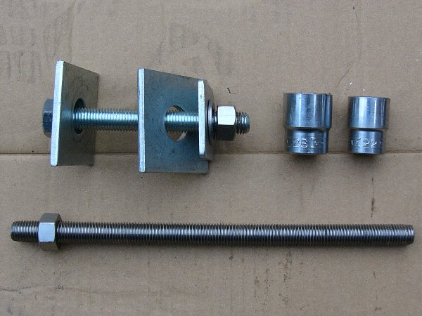 ・フロントベアリングの圧入では「ネジ下110㎜のM16ボルト」が使えますが、 リヤのベアリング圧入には「ネジ長が200㎜以上」必要です。 そのようなボルトがありませんので、 ステンレス・寸切りボルト・285㎜ (477円) を使いました。 スチールでも構いません。スチールなら90円くらいです。 使用するソケットは、 ・26M:前輪ベアリング/6003番打ち込み用(外輪とピッタリでハブ穴に入る) ・22M:後輪外側ベアリング/6204番取り外し用(内輪とピッタリ) ・16M:前輪ベアリング/6003番取り外し用(内輪とピッタリ)※写真には写っていません。 ・20㎜Φのベアリングが外せるパイロットベアリングプーラーも必要です。→→→こちら |