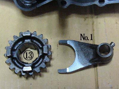⑬ 5thドリブンギヤ 19枚 右側/かみ合い凸 左側/シフトフォーク溝(シフトフォーク№1) シフトフォーク№1:長くて狭い №1の刻印は下側/左側 シフトフォーク№1,№2をシャフトで仮止め。 |
